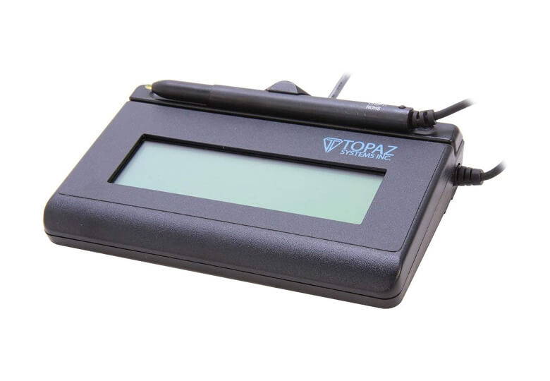 Advanced, rugged, and durable Topaz LCD electronic signature pad with LCD tempered glass display.